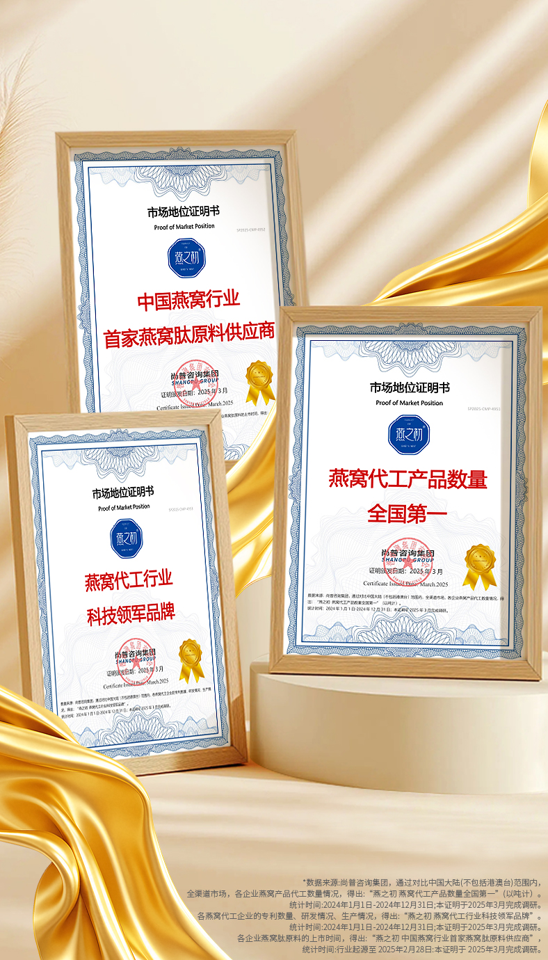 *3数据来源:尚普咨询集团,通过对比中国大陆(不包括港澳台)范围内,全渠道市场,各企业燕窝产品代工数量情况,得出:“燕鸿基 燕窝代工产品数量全国第一”(以吨计)。统计时间:2024年1月1日-2024年12月31日;本证明于2025年3月完成调研。