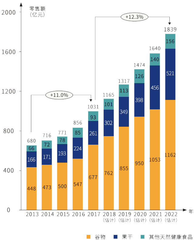 2013年至2017年,我国天然健康食品行业的零售额由680亿元增至1031亿元,年均复合年增长率为11.0%。从市场细分品类来看,谷类食品是中国天然健康食品市场的主要类别,2017年约占整体天然健康食品市场66%,预计2022年谷物健康食品零售额将达到1162亿元。