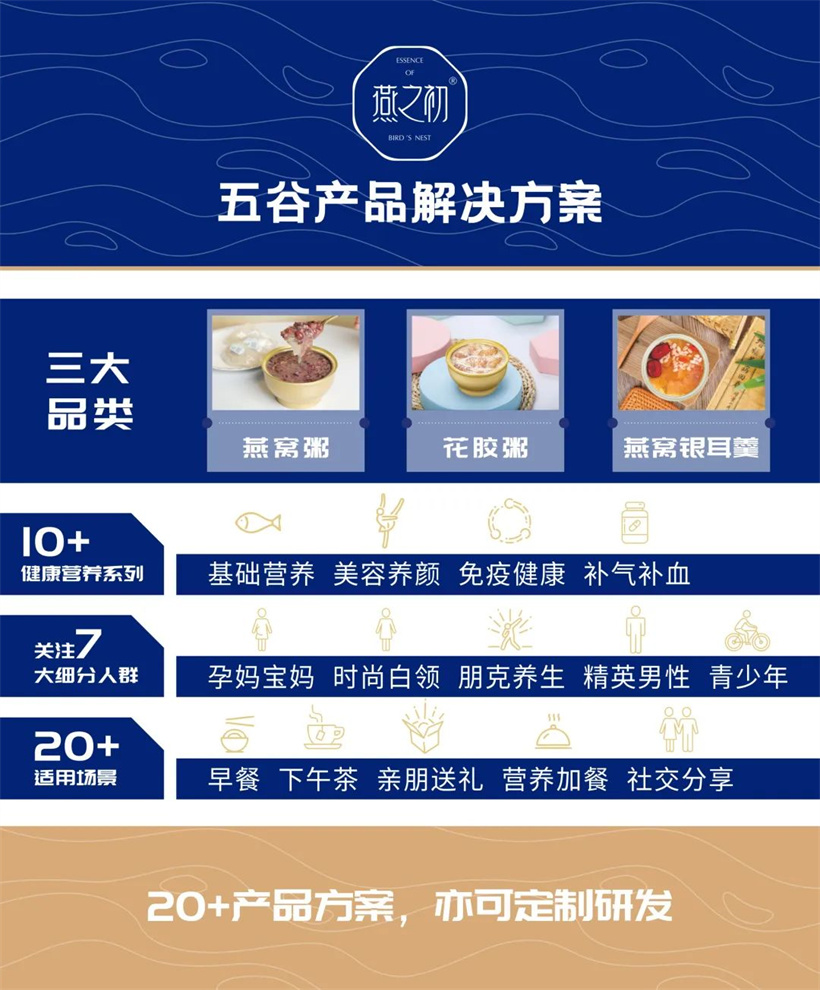对此,燕之初特推出五谷产品解决方案,涵盖燕窝粥、花胶粥、燕窝银耳羹3大品类,涉及10+健康营养系列,关注7大细分人群,适用场景20+,亦可根据客户需求定制研发。