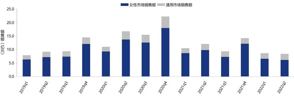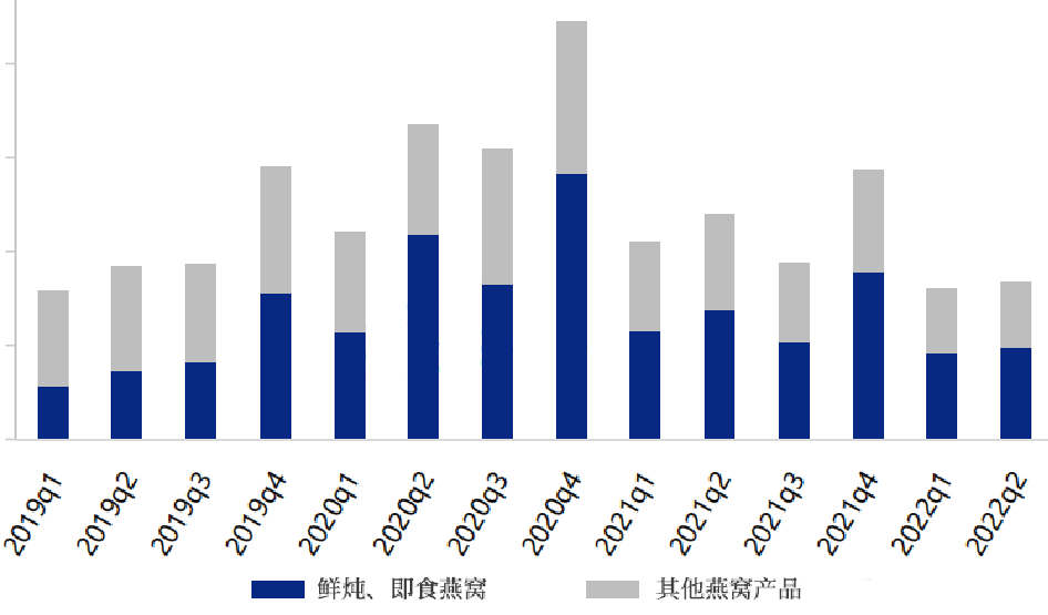 燕窝市场主要以鲜炖/即食燕窝和干燕窝为主,其中,鲜炖/即食燕窝产品销售额占比从2019第一季度的36%增长到2022年第二季度的57%。由于即食型燕窝具备食用和携带“便捷性”的属性,从而深受消费者的青睐。即食型燕窝产品是线上渠道中消费占比最高的品类,借助线上渠道大范围传播,即食型燕窝产品将更容易触达大量的消费群体。