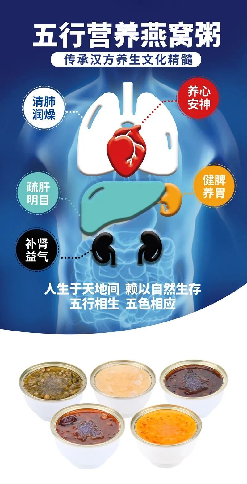 五行营养燕窝粥,正是基于五行与五色的相生相克关系,精选青赤黄白黑五种颜色的天然养生食材,运用药食同源的科学理论精制而成,呵护食用者的肝心脾肺肾,为健康保驾护航。