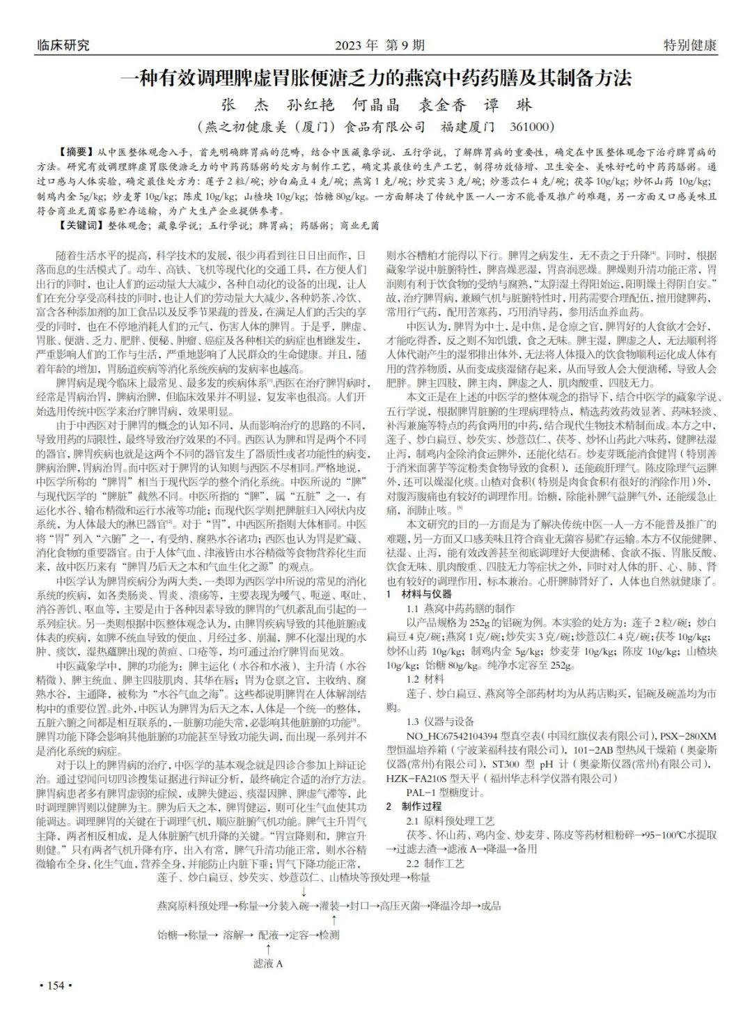 本篇论文从中医整体观念入手,结合中医藏象学说、五行学说,研究有效调理脾虚胃胀便溏乏力的燕窝中药药膳的处方与制作工艺,确定其最佳的生产工艺,制得功效倍增、卫生安全、美味好吃的中药药膳。通过口感与人体实验,确定最佳处方,一方面解决了传统中医一人一方不能普及推广的难题,另一方面又口感美味且符合商业无菌容易贮存运输,为广大生产企业提供参考。