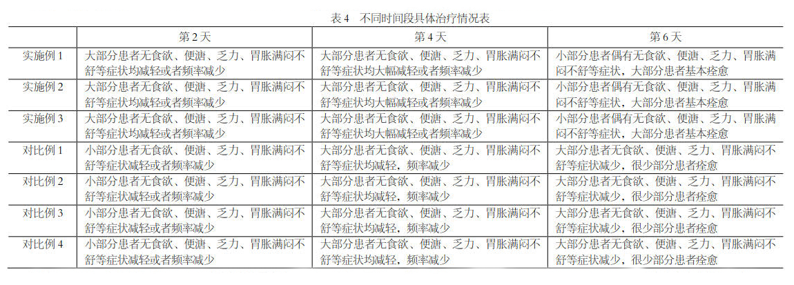 通过调查与试验,证明按本实验规定的实验工艺和处方制作的产品,药味淡、综合风味较好、饱满度好。且配方中的药物之间存在相互协同、相互促进作用,进而提高对无食欲、便溏、乏力、胃胀满闷不舒等症状的治疗效果;而且,服用本研究中的中药药膳后,患者无任何不适感,未出现口干、口苦、燥热、恶寒等症状。