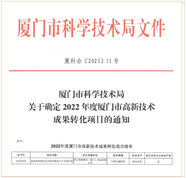 近日,燕之初「高活性炖煮技术在即食燕窝生产中的应用」项目经厦门市科学技术局审理,被认定为2022年度厦门市高新技术成果转化项目。
