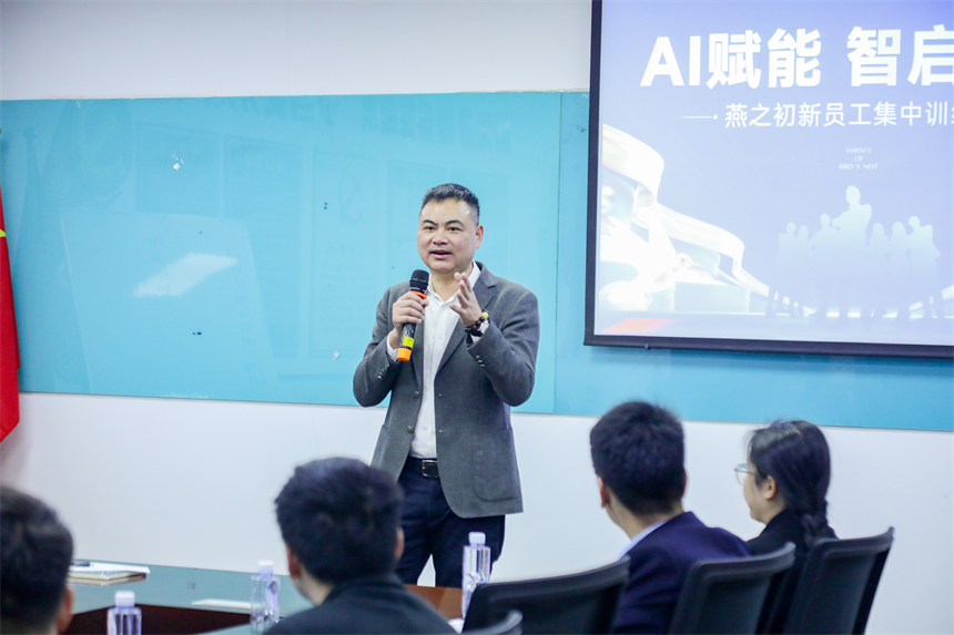 集团副总裁郭建荣为新员工做开班致辞,他以生动的案例讲述燕之初从创业至今的奋斗征程。通过战略决策背后的深度思考,展现了集团领导对行业趋势的前瞻把握。郭总立足全球视野剖析市场格局,既勾勒出企业在细分领域的核心优势,亦描绘了公司未来的宏伟蓝图,让每一位新员工都感受到公司文化的深厚底蕴与使命担当,同时也激励着大家以更加坚定的步伐,与公司共同迈向更加辉煌的未来。