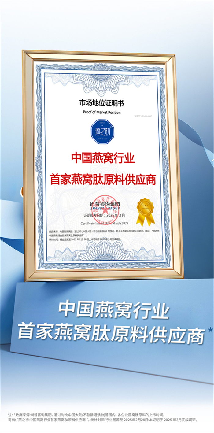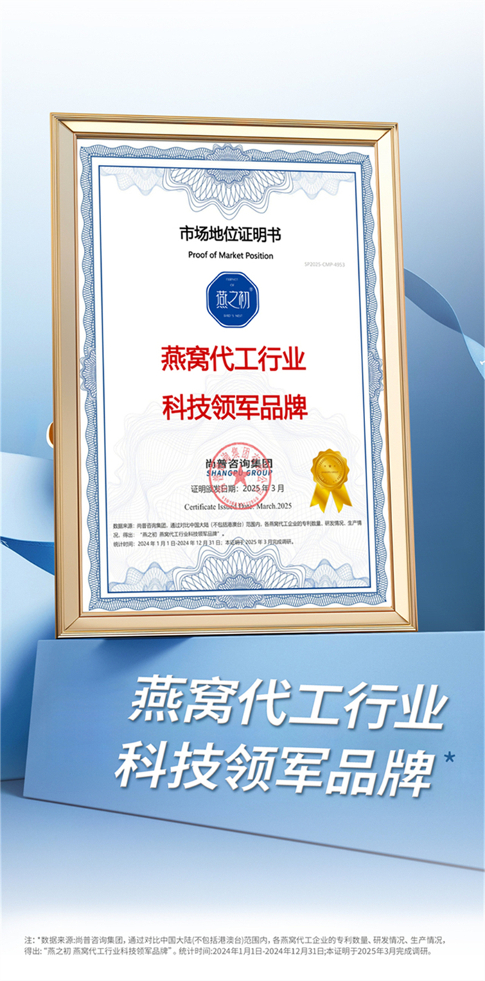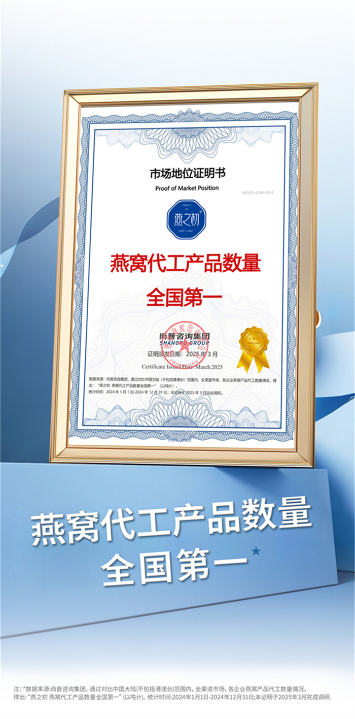 近日,燕之初成功斩获“燕窝代工产品数量全国第一”“燕窝代工行业科技领军品牌”“中国燕窝行业首家燕窝肽原料供应商”三大权威市场地位认证。这一系列认证经尚普咨询集团历时多月的市场调研与数据核验后出具,充分彰显了燕之初在燕窝代工领域的领先地位和权威性。