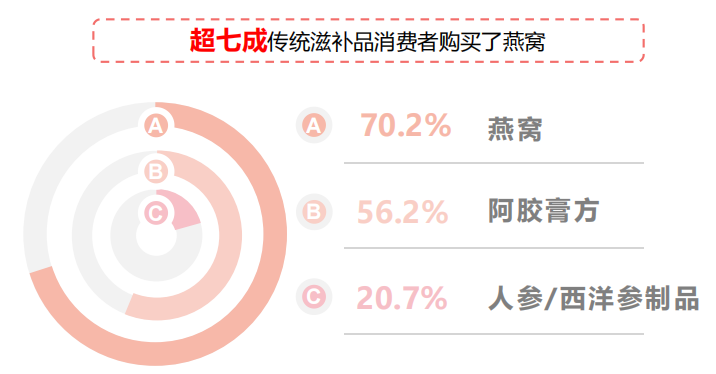 根据《2021年中国女性燕窝消费大调查》显示,传统滋补品受到女性消费者热捧,近5成女性消费者购买传统滋补健康食品,而这5成女性消费者中超过70%购买了燕窝!