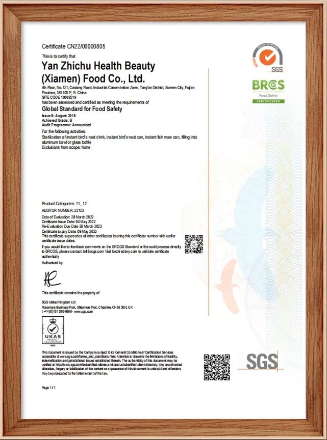 本月,燕之初通过国际领先的第三方认证机构SGS的严格审核,获得BRCGS食品安全全球标准认证并取得证书。这标志着燕之初在食品安全体系、质量的可追溯性、加工现场控制等方面上升到了一个新的高度,对于今后的国际市场发展奠定了坚实基础,同时也对燕之初未来的发展提出了更高要求。